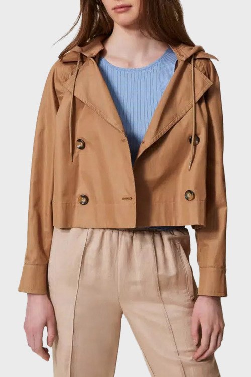 Детали: Женская коричневая хлопковая куртка-жакет от TWINSET (Твинсет). Двубортный фасон, вшитый капюшон, боковые карманы, застежка на пуговицы, укороченная длина