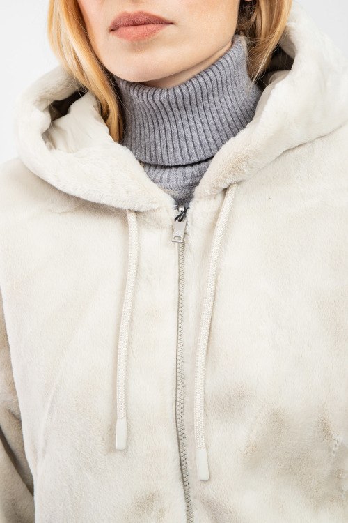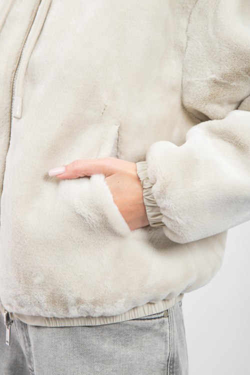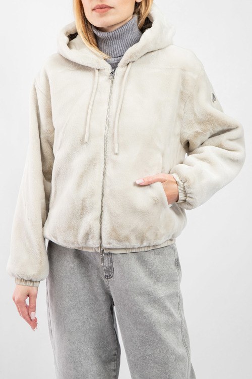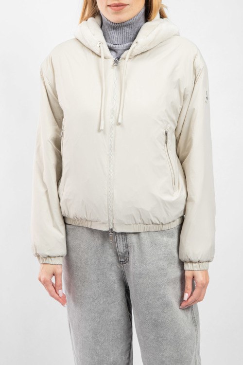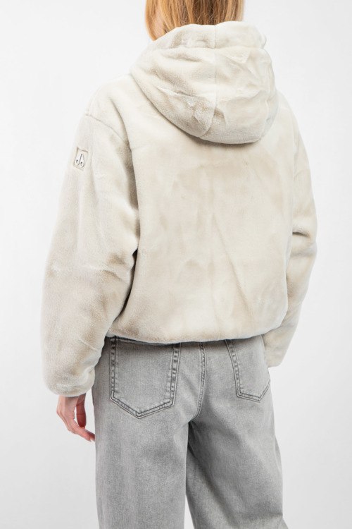 Женская кремовая двухсторонняя куртка с капюшоном Eaton от Moose Knuckles (Мус Наклс). Одна сторона из нейлона, вторая из экомеха. Вшитый капюшон, боковые карманы на молнии, застежка-молния, классическая длина, манжеты и нижний край на резинке.