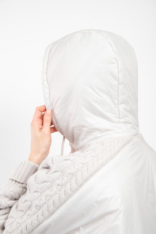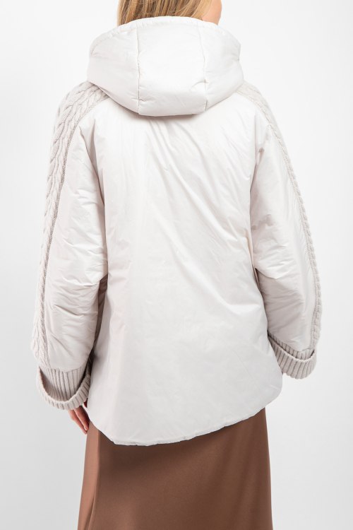 Женская куртка молочного оттенка из полиамида от Panicale Cashmere (Паникале Кашемир). Модель декорирована вязанной вставкой из шерсти и кашемира, застежка на пуговицы, вшитый капюшон с кулиской, прорезные карманы, широкие рукава с трикотажными манжетами, модель на синтепоне. Замеры для размера 42: Длина: 78 см, ширина по груди: 63 см, ширина по талии: 65 см, длина рукава по внутреннему шву: 39 см.