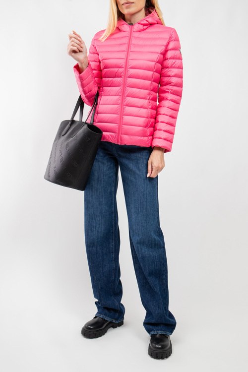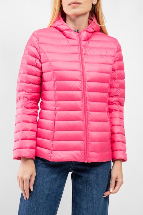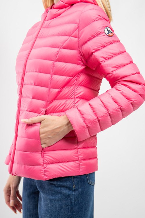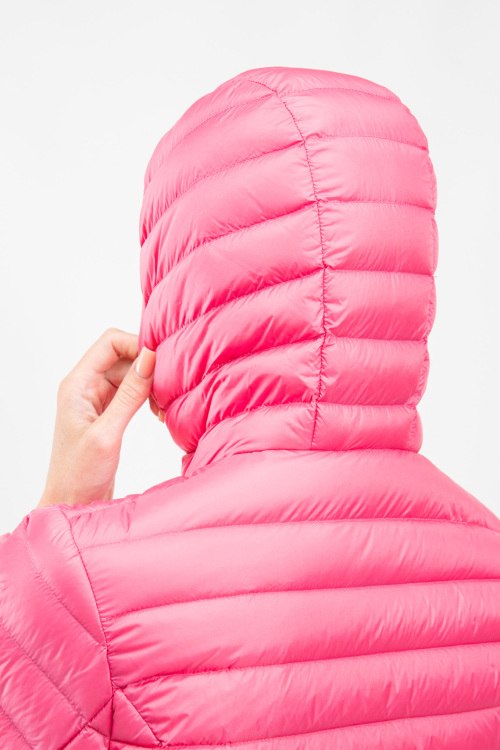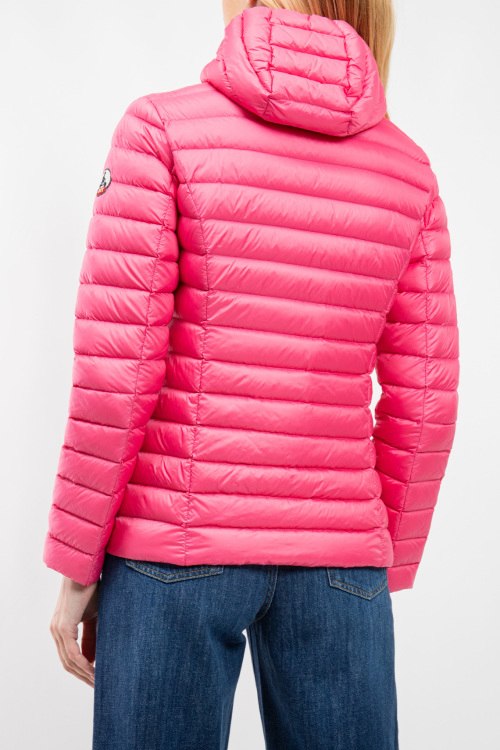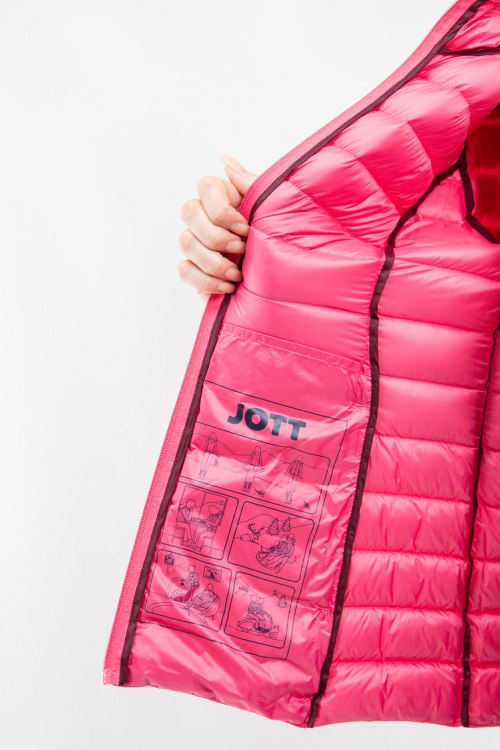 Женская розовая куртка на пуху от Jott (Йотт). Стеганый дизайн, вшитый капюшон, нашивка с логотипом на рукаве, боковые карманы на молнии, застежка-молния, классическая длина, наполнитель из микса пуха и пера.
