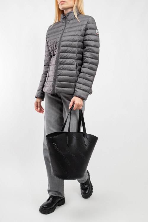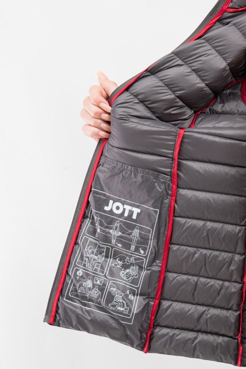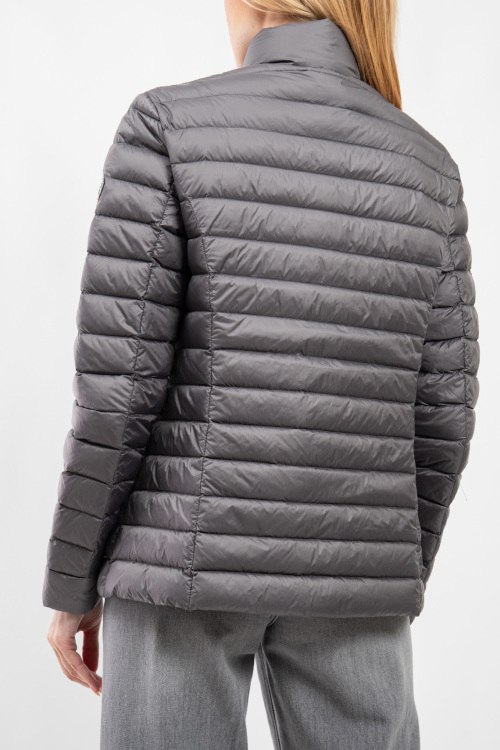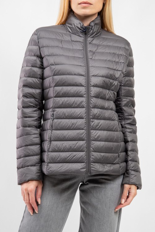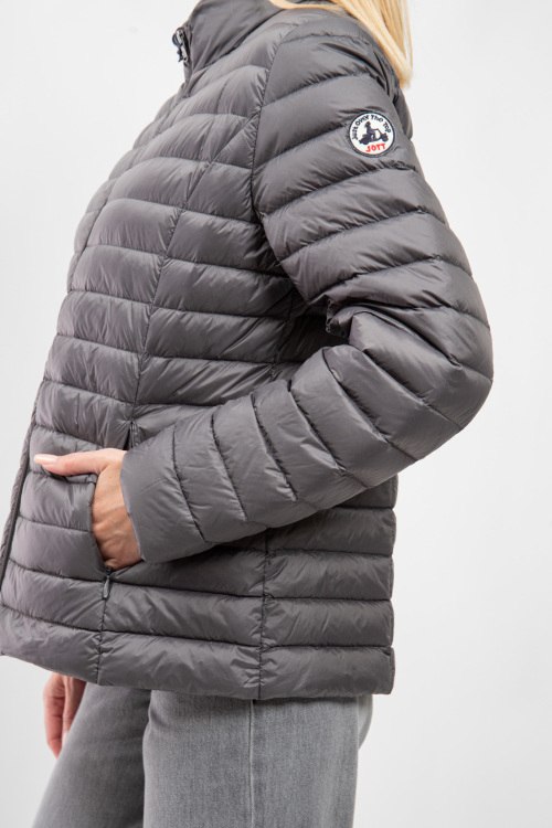 Женская серая куртка на пуху от Jott (Йотт). Стеганый дизайн, высокий воротник, нашивка с логотипом на рукаве, боковые карманы на молнии, застежка-молния, классическая длина, наполнитель из микса пуха и пера.