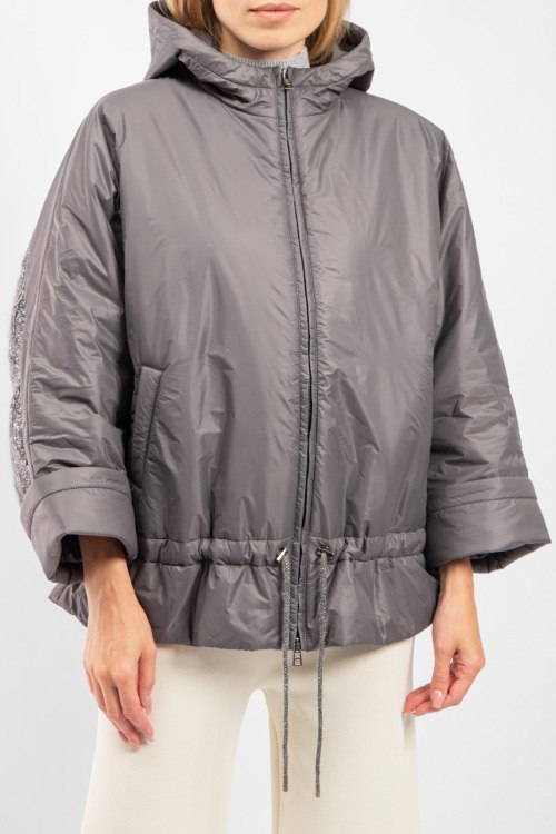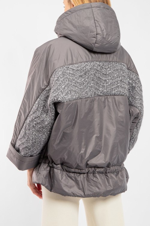 Женская серая утепленная куртка от Panicale Cashmere (Паникале Кашемир). Вшитый капюшон, вязаная вставка, боковые карманы, застежка-молния, нижний край на кулиске, укороченный рукав, классическая длина. Размер вещи на фото: 44. Замеры: длина: 70 см, ширина по груди 73 см, ширина по талии 56 см, ширина рукава: 29 см.
