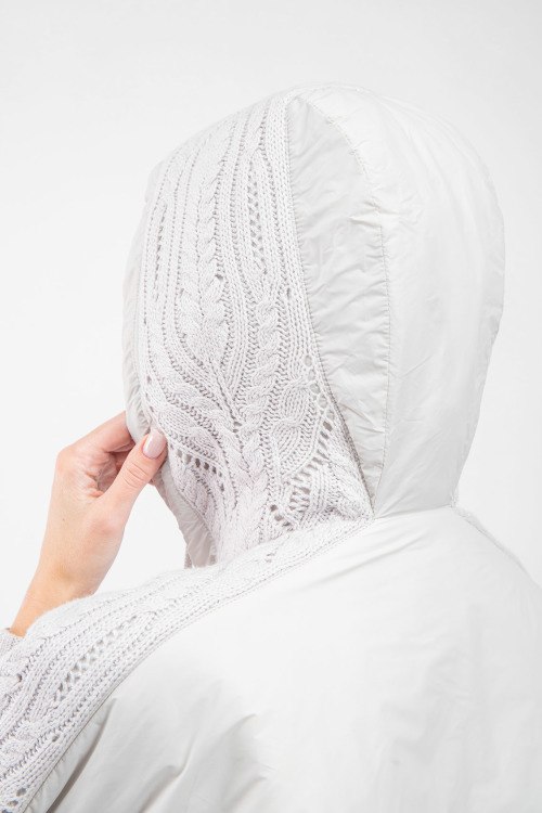 Женская светло-серая куртка от Panicale Cashmere (Паникале Кашемир). Вязаные вставки на рукавах и на капюшоне, боковые карманы, застежка-молния, разрезы по бокам, удлиненная длина.