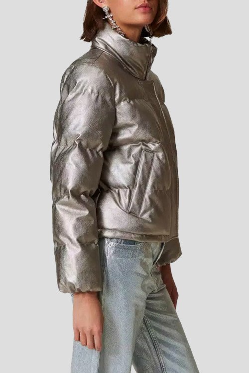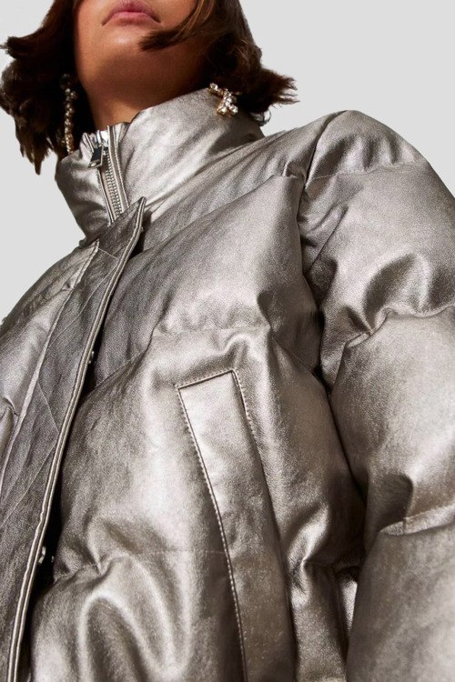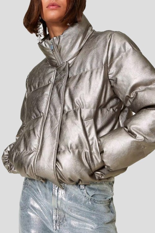 Женская серебристая утепленная куртка от TWINSET (Твинсет). Короткая куртка из коллекции Actitude с эффектом ламинированной кожи и высоким воротником. Имеет потайную застежку-молнию спереди, длинные рукава с манжетами на резинке, прорезные карманы, подкладку с ватным наполнителем и короткий дутый фасон с внутренней кулиской по нижнему краю для регулировки объема. Рост модели: 178 см. Модель демонстрирует размер: XS/40
