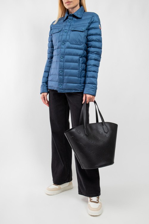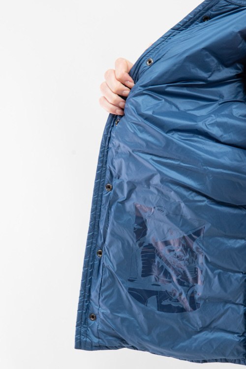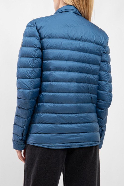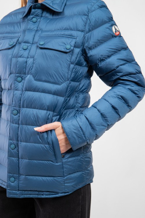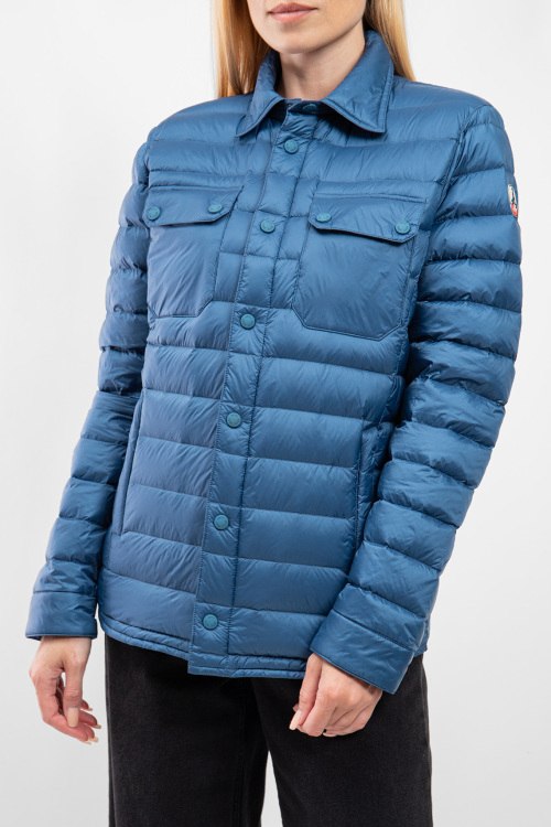 Женская синяя куртка на пуху от Jott (Йотт). Стеганый дизайн, отложной воротник, нашивка с логотипом на рукаве, два кармана на груди, боковые карманы, застежка на кнопки, классическая длина, наполнитель из микса пуха и пера.