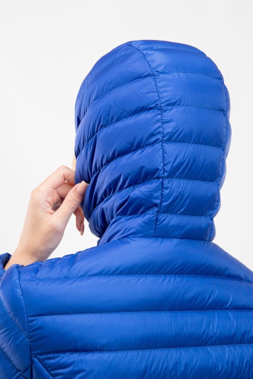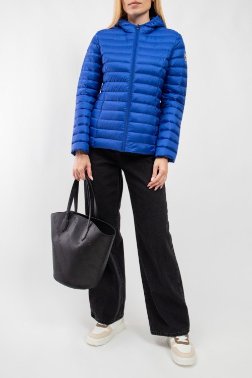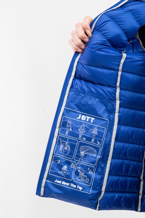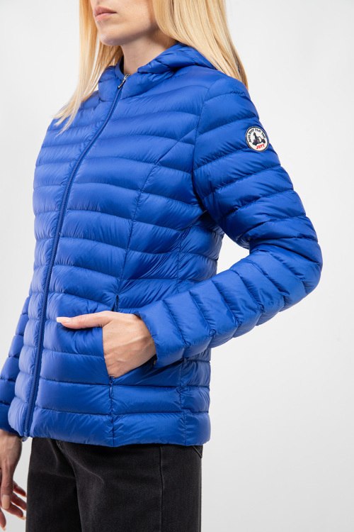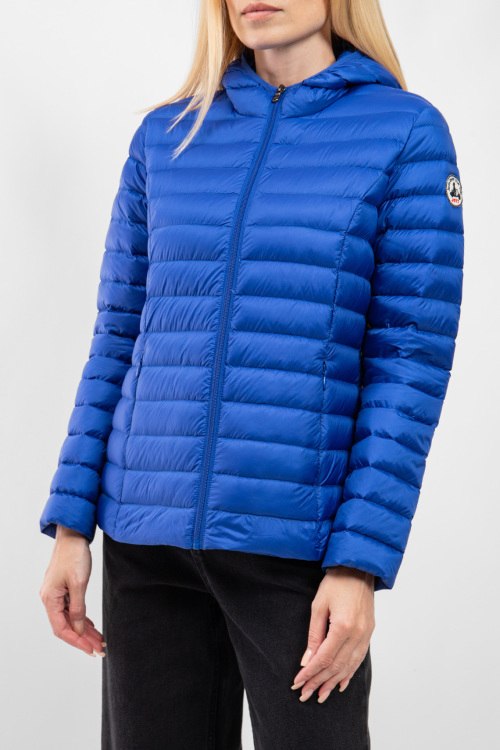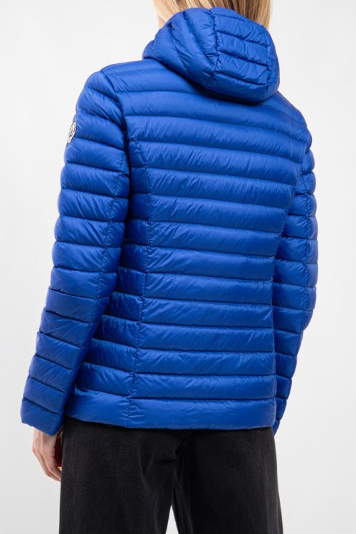 Женская синяя куртка на пуху от Jott (Йотт). Стеганый дизайн, вшитый капюшон, нашивка с логотипом на рукаве, боковые карманы на молнии, застежка-молния, классическая длина, наполнитель из микса пуха и пера.