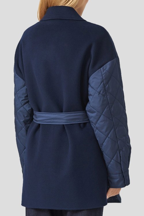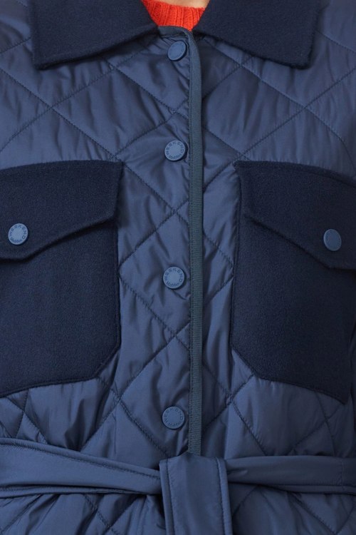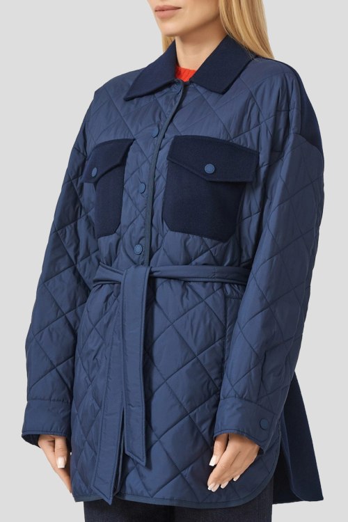 Детали: Женская темно-синяя куртка из шерсти и полиэстера от Max Mara (Макс Мара). Комбинированный дизайн, классический воротник, застежка на кнопки, пояс в тон изделия, нагрудные карманы с клапаном, прорезные карманы
