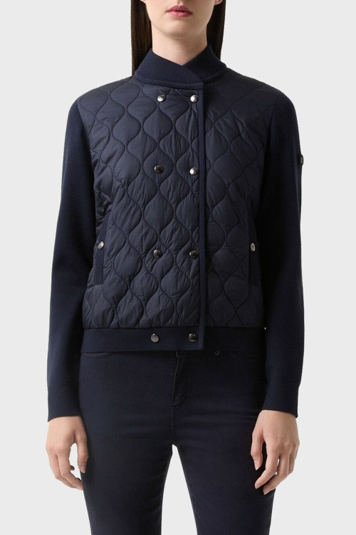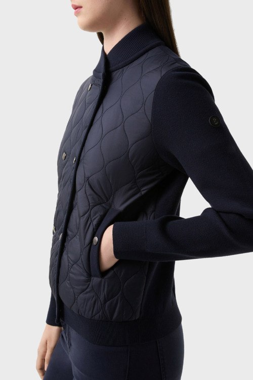 Детали: Женская темно-синяя комбинированная куртка Becca от Bogner (Богнер). Комбинация материалов, воротник-стойка, нашивка с логотипом на рукаве, боковые карманы на кнопке, застежка на кнопки, классическая длина
