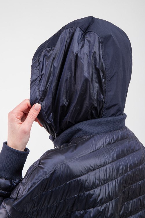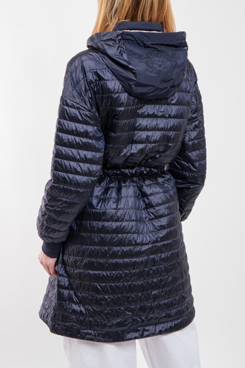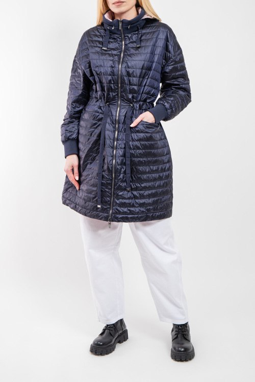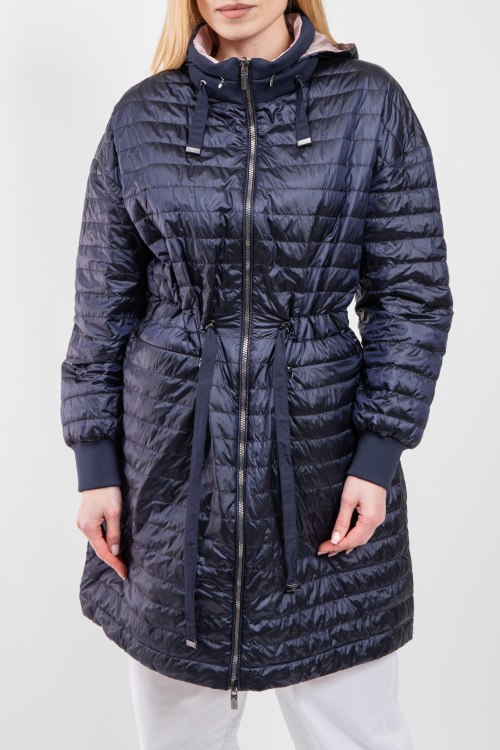 Женская темно-синяя куртка из полиэстера от Diego M (Диего М). Удлиненная модель, двухсторонний дизайн, воротник-стойка, застежка на молнию, потайной вшитый капюшон, кулиска на поясе, прорезные карманы. Замеры для размера 48: длина: 93 см, ширина по груди: 63 см, ширина по талии: 59 см, ширина по бедрам: 64 см, длина рукава по внутреннему шву: 45 см, ширина рукава: 22 см.