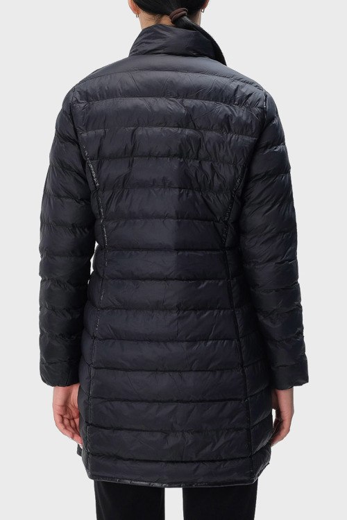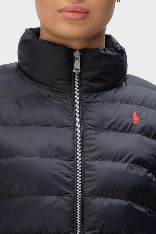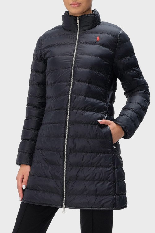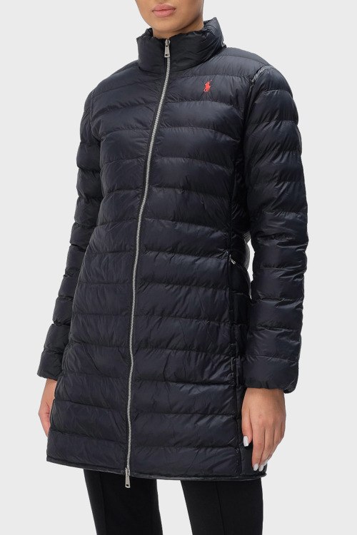 Женская темно-синяя куртка из нейлона от Ralph Lauren (Ральф Лорен). Удлиненная модель, высокий воротник-стойка, застежка на молнию, вышитый логотип бренда на груди, приталенный силуэт, прорезные карманы