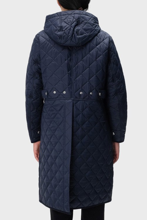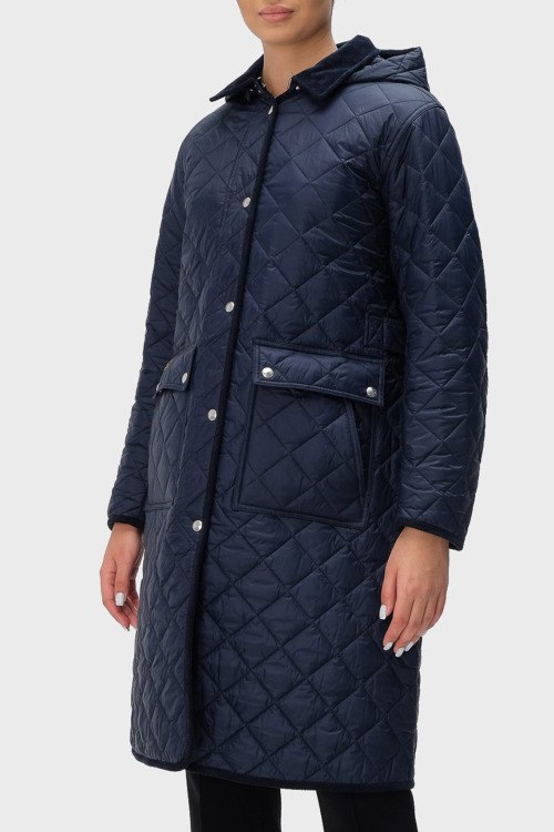 Женская темно-синяя куртка из нейлона от Ralph Lauren (Ральф Лорен). Стеганый дизайн, классический воротник, застежка на кнопки, карманы с клапаном, вшитый капюшон, модель утепленная синтепоном