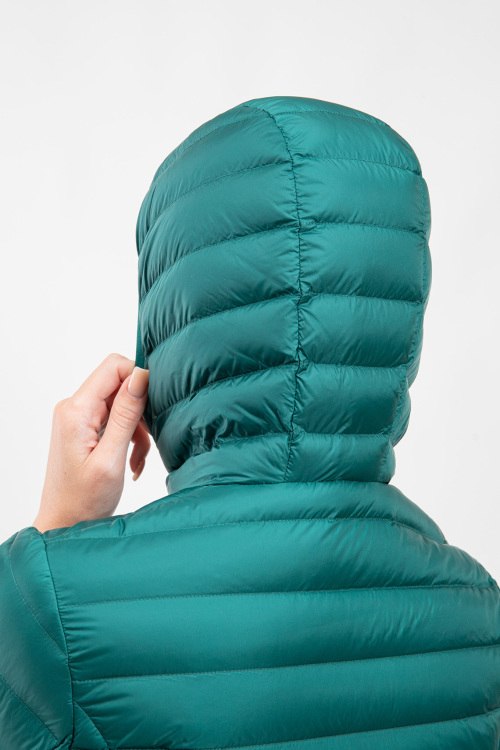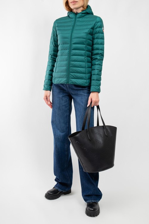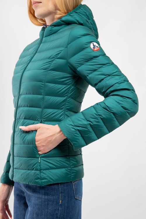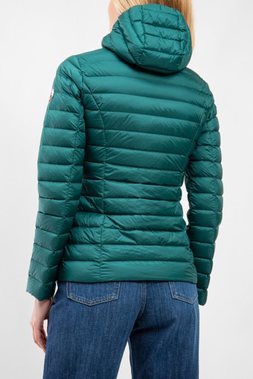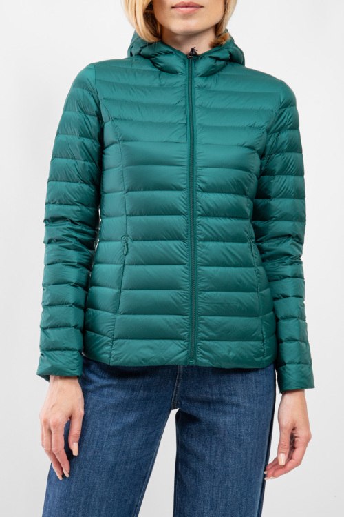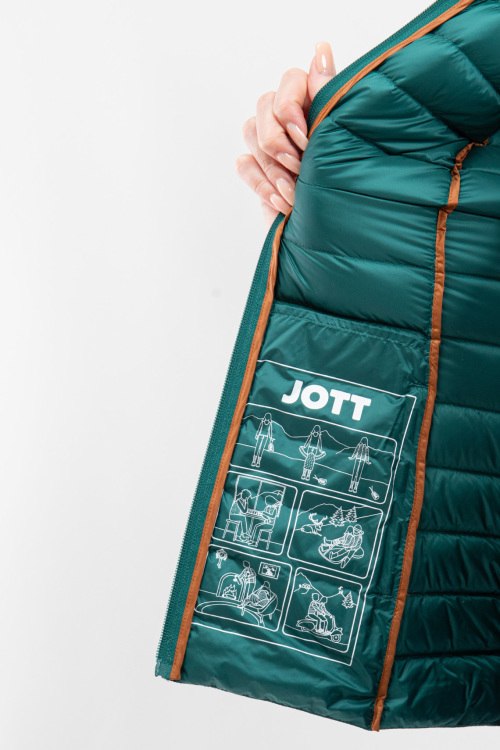 Женская зеленая куртка на пуху от Jott (Йотт). Стеганый дизайн, вшитый капюшон, нашивка с логотипом на рукаве, боковые карманы на молнии, застежка-молния, классическая длина, наполнитель из микса пуха и пера.
