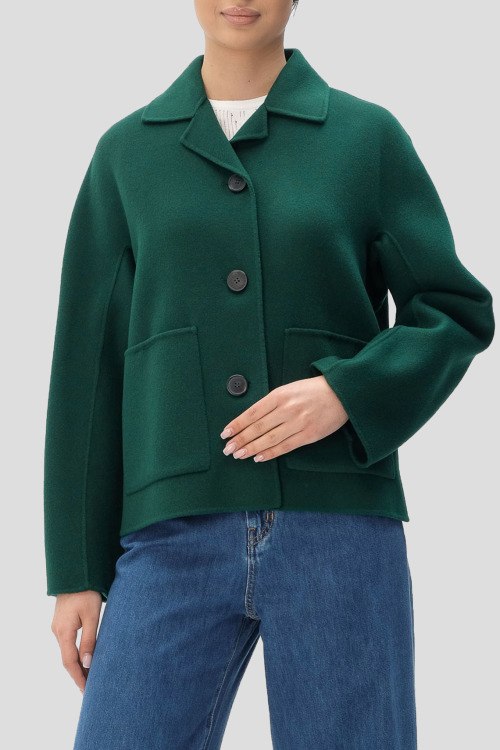 Детали: Женская зеленая куртка из шерстяного микса от Max Mara Weekend (Макс Мара Викенд). Отложной воротник, застежка на крупные пуговицы, длинные рукава, накладные карманы