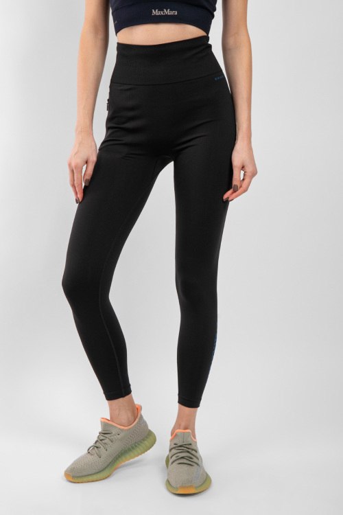 Женские черные леггинсы Villa от Max Mara Leisure (Макс Мара Лэжэ). Облегающий фасон, принт с логотипом сбоку, высокая посадка, один боковой карман на молнии.
