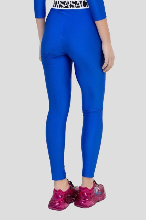 Детали: Женские синие леггинсы от Versace (Версаче). Высокая талия, брендированный эластичный пояс, облегающий фасон, полная длина