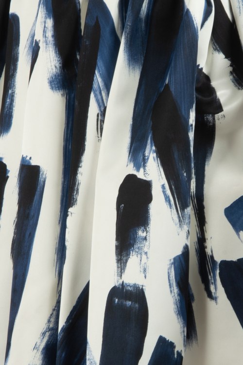 Платье белого цвета с темно-синим принтом из шелка. Модель без рукавов, приталенный крой, круглый вырез под горло, длина - миди.
