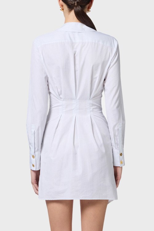 Детали: Женское белое платье из хлопка от Elisabetta Franchi (Елизабетта Франчи). Длина мини, V-образный вырез горловины, длинные рукава, дизайн в полоску, золотистая фурнитура, асимметричный низ изделия
