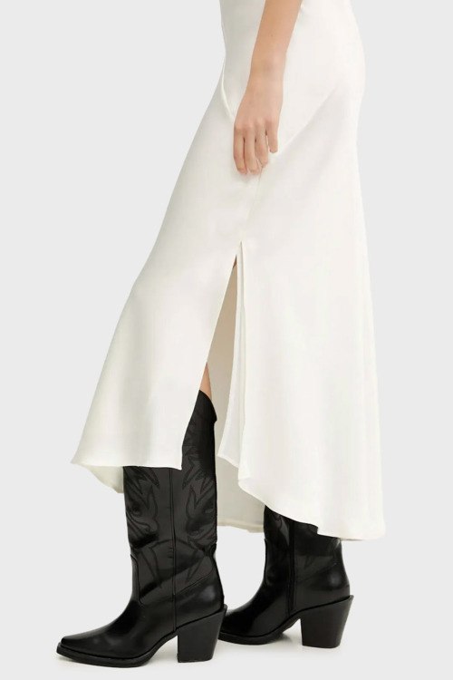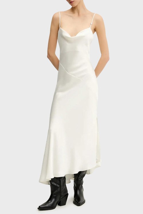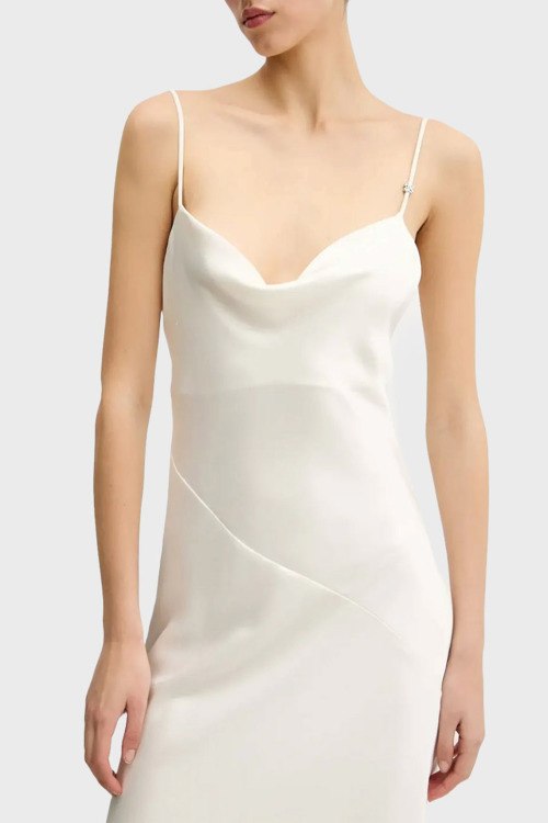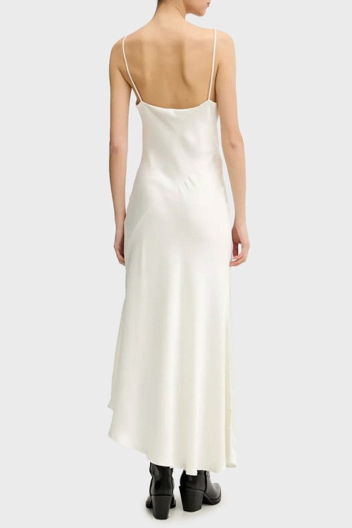 Детали: Женское белое платье-миди Katea-1 от Hugo by Hugo Boss (Хуго бай Хуго Босс). Модель в бельевом стиле, тонкие бретели с логотипом, вырез на спине, асимметричный нижний край, длина-миди