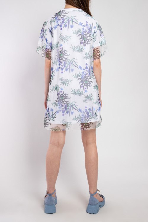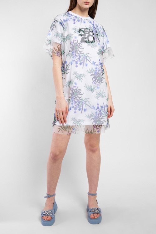 Детали: Женское белое хлопковое платье-футболка от Kenzo (Кензо). Двуслойный дизайн, цветочный принт, принт с логотипом, круглый вырез горловины, короткий рукав, короткая длина
