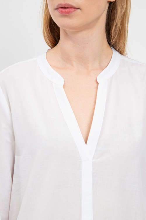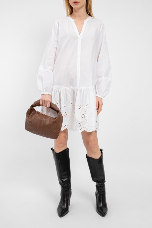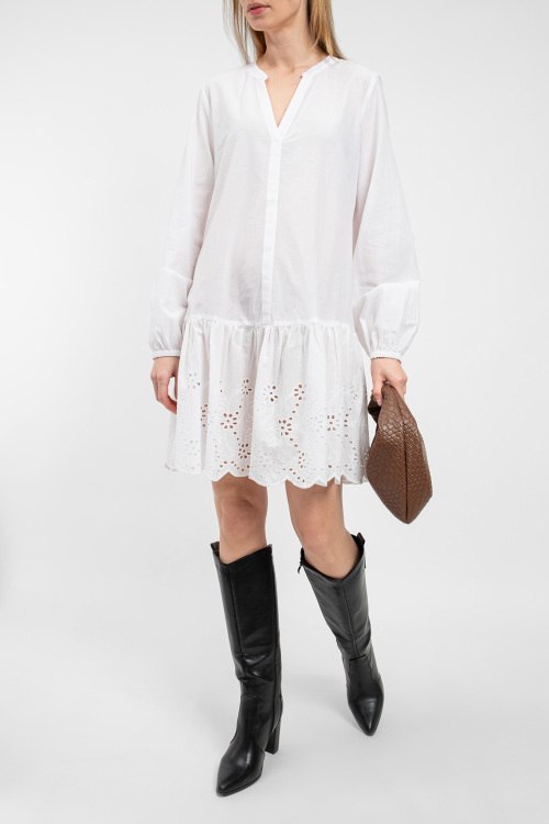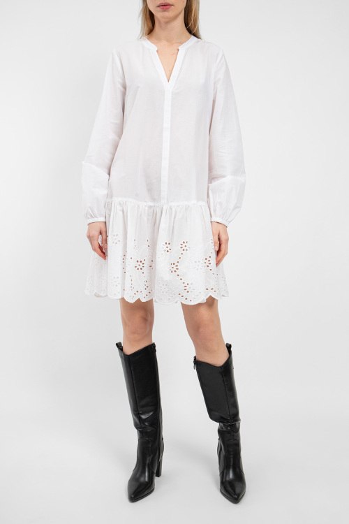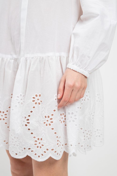 Детали: Женское белое хлопковое платье от Lascana (Ласкана). V-образный вырез, длинный широкий рукав с манжетом на резинке, расклешенная юбка с перфорацией, длина выше колен