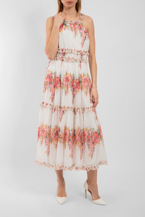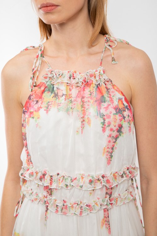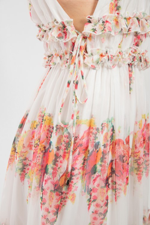 Женское белое платье из хлопкового микса от Buby S (Баби Эс). Длина миди, модель декорирована цветочным принтом и рюшами, тонкие регулируемые бретели, ровный подол. Замеры для размера S: длина: 118 см, ширина по груди: 34 см, ширина по талии : 29 см, ширина по бедрам: 47 см.