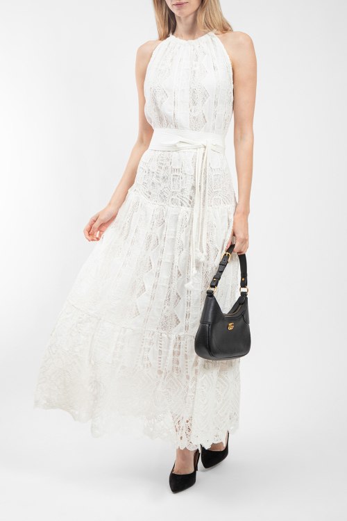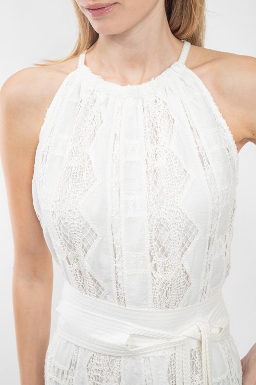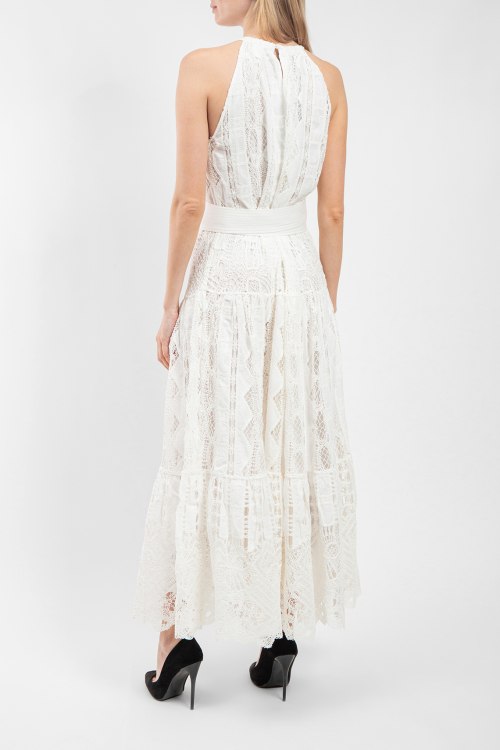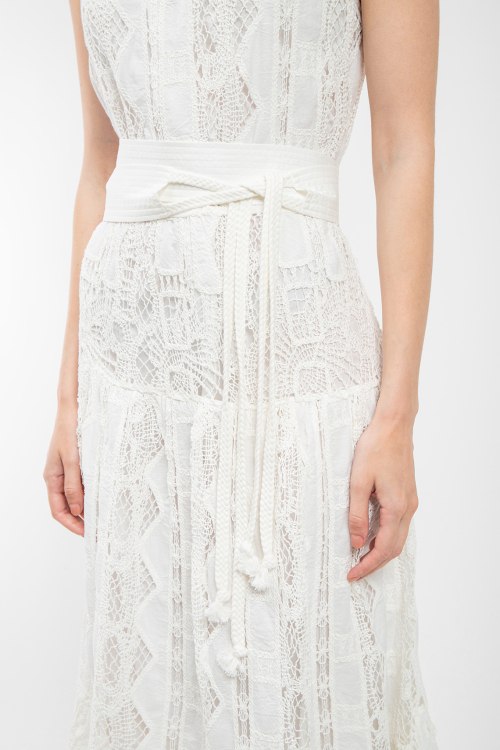 Женское белое хлопковое платье от Pinko (Пинко). Модель без рукавов, вышивка по всей поверхности, круглый вырез горловины, в талии с поясом, длина-макси.