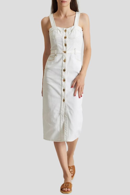 Детали: Женское белое джинсовое платье от Pinko (Пинко). Пяти-карманная модель, не регулируемые шлейки, в поясе с петлями для ремня, застежка на пуговицы, длина-миди