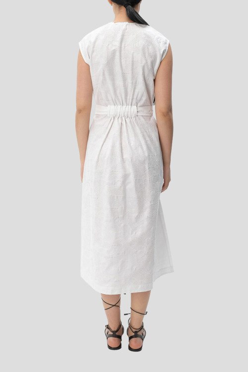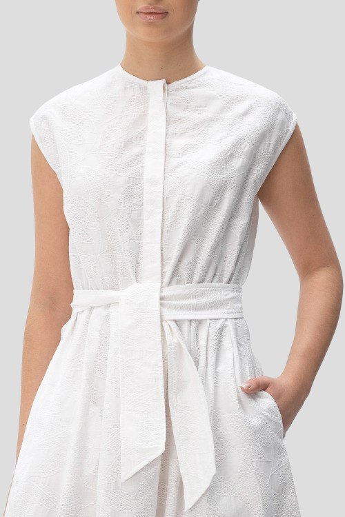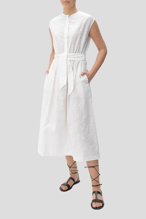 Детали: Женское белое хлопковое платье от Tonet (Тонет). Модель без рукавов, вышивка в тон по всей поверхности, боковые карманы, в талии с поясом, длина-миди