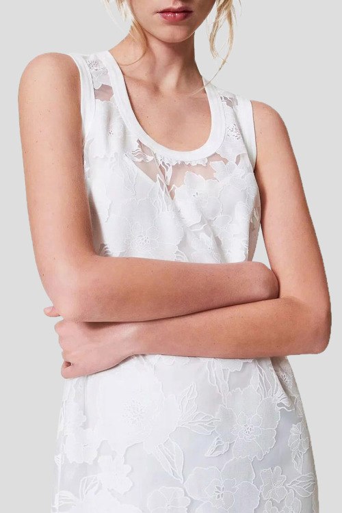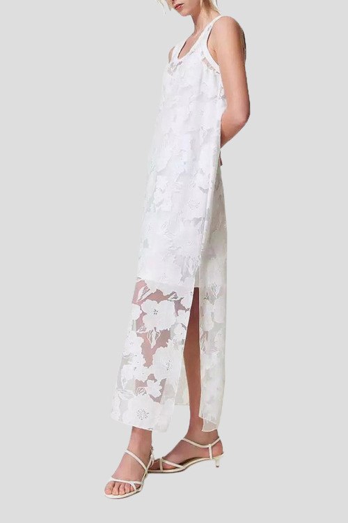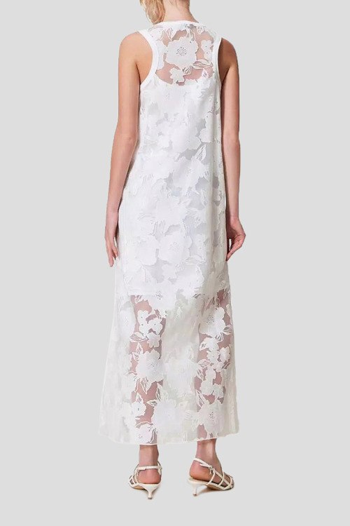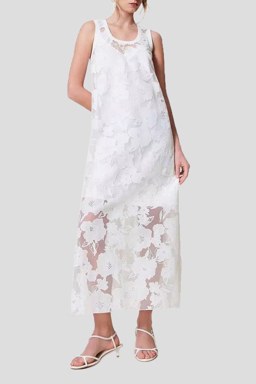 Детали: Женское белое платье из органзы от TWINSET (Твинсет). Модель без рукавов, цветочный узор по всей поверхности, на подкладке, длина-миди