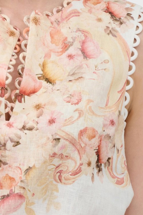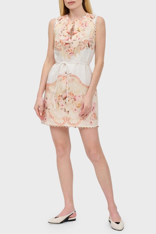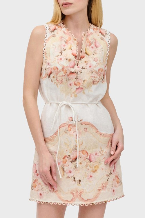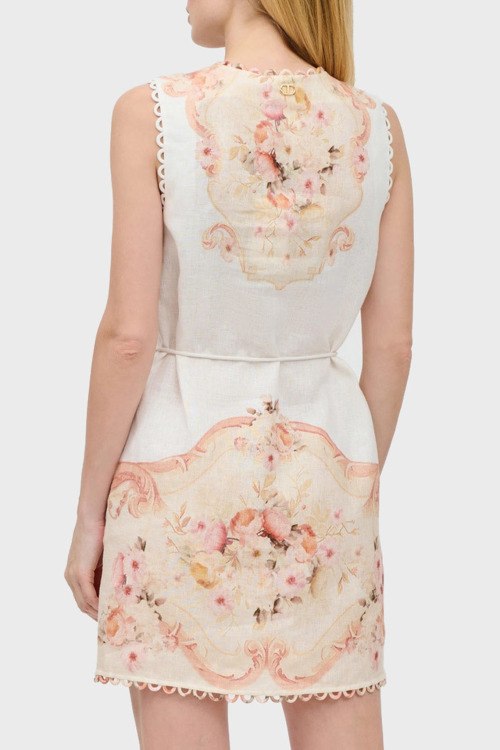 Детали: Женское белое льняное платье от TWINSET (Твинсет). Модель без рукавов, цветочный принт в бежево-розовых тонах, в талии с тонким поясом, короткая длина