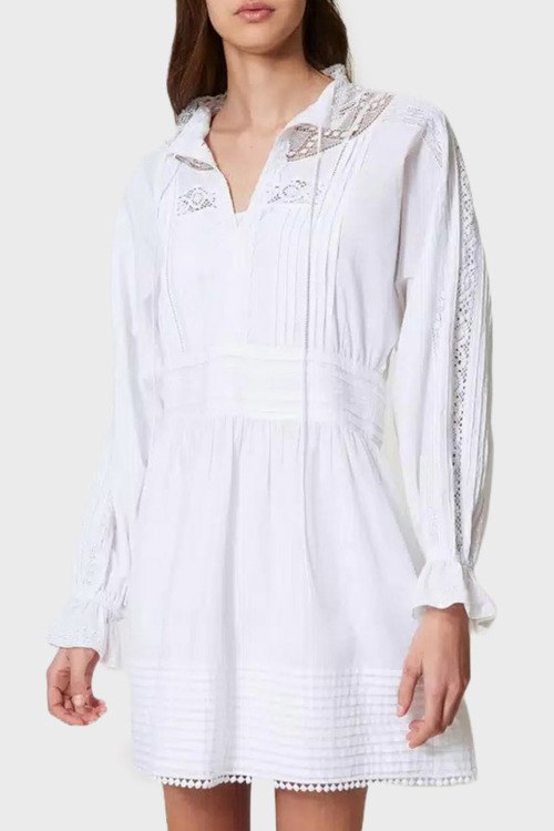 Детали: Женское белое хлопковое платье от TWINSET (Твинсет). Воротник на завязках, декор вышивкой, длинный рукав с расклешенным манжетом, короткая длина