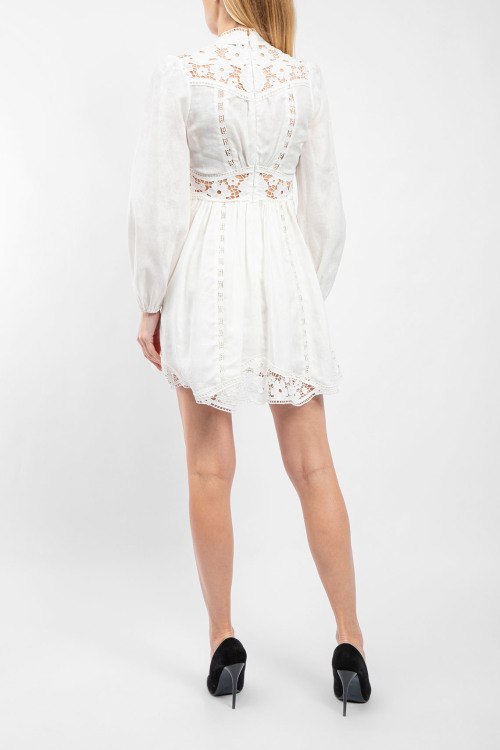 Детали: Женское белое льняное платье August Plunge от Zimmermann (Циммерманн). Декор вышивкой и кружевными вставками, воротник-стойка, V-образный вырез, длинный рукав, застежка на пуговицы, короткая длина