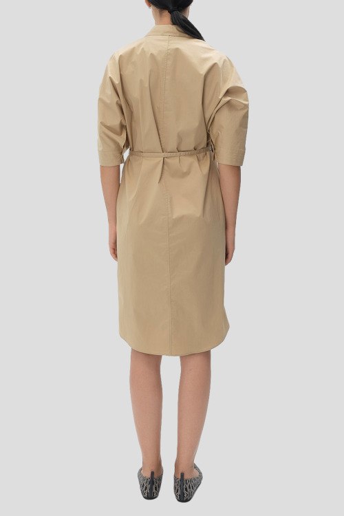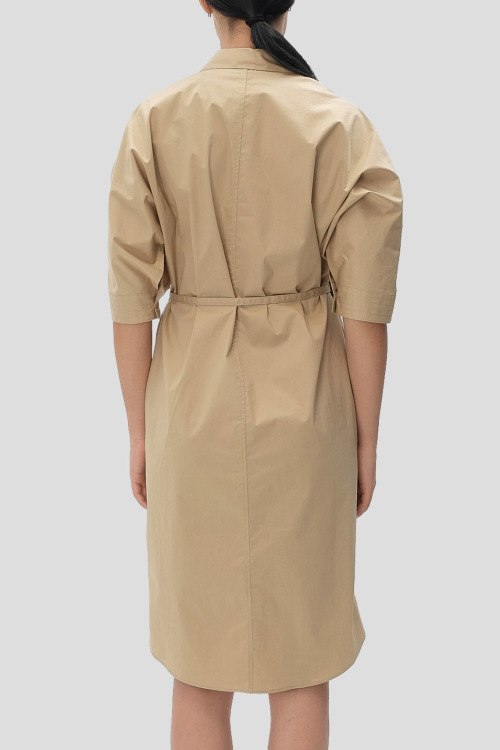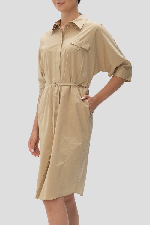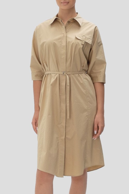 Детали: Женское бежевое хлопковое платье-рубашка Dirisia от Hugo Boss (Хуго Босс). Отложной воротник, карман на груди, боковые карманы, скрытая застежка на пуговицы, в талии с поясом, укороченный рукав, длина до колен