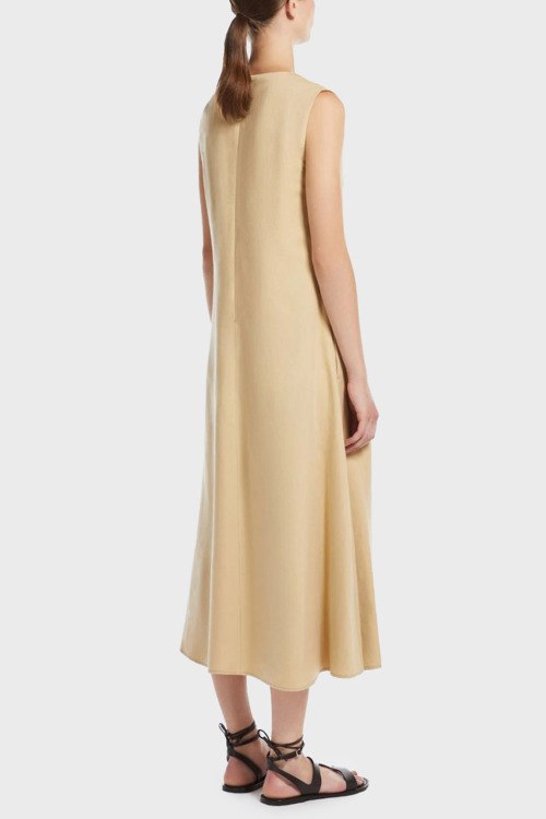 Детали: Женское бежевое платье из вискозы и льна Egoista от Max Mara Weekend (Макс Мара Викенд). Модель без рукавов, V-образный вырез, боковые карманы, свободный фасон, длина-миди