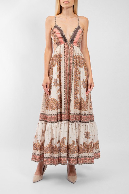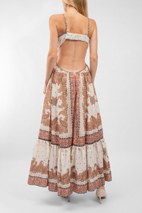 Женский бежевый льняной сарафан Maxine Plunge от Zimmermann (Циммерманн). Модель на тонких бретельках, принт пейсли по всей поверхности, глубокий V-образный вырез на груди, вырез на спине, боковые карманы, длина-макси.
