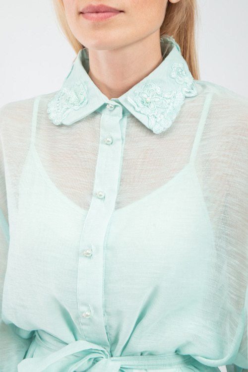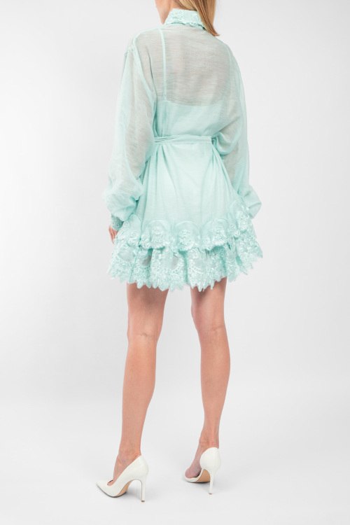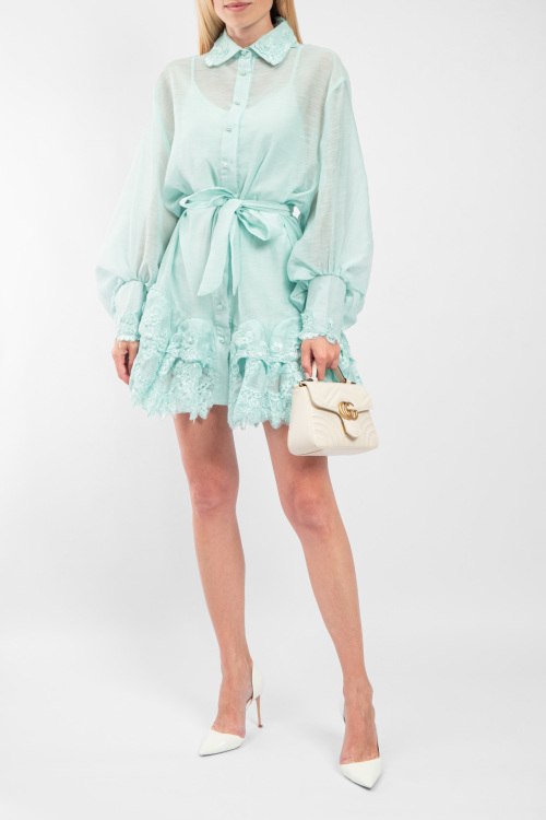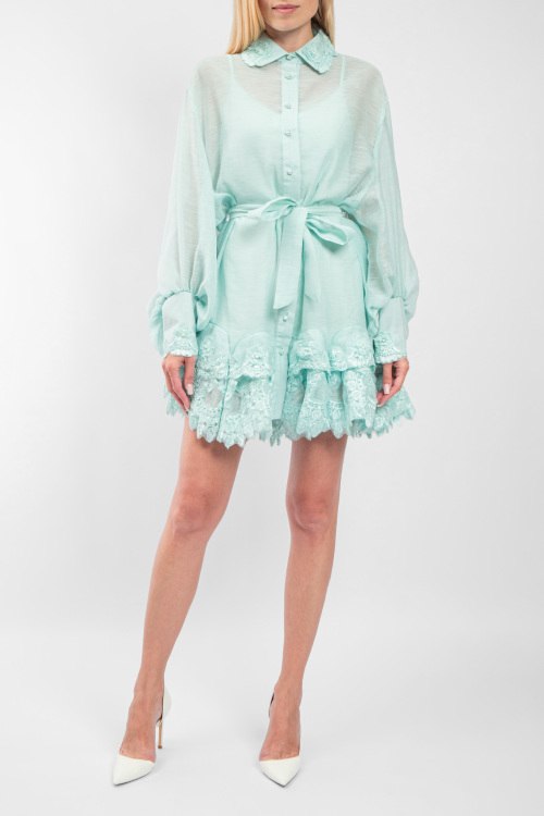 Женское бирюзовое платье-рубашка из льна и шелка Crush от Zimmermann (Циммерманн). Отложной воротник с цветочной аппликацией. длинный широкий рукав с высокими манжетами, застежка на пуговицы, в талии с поясом, короткая длина.