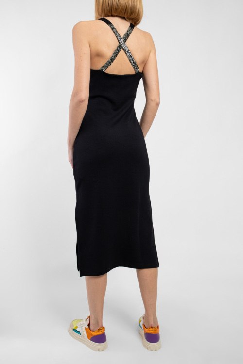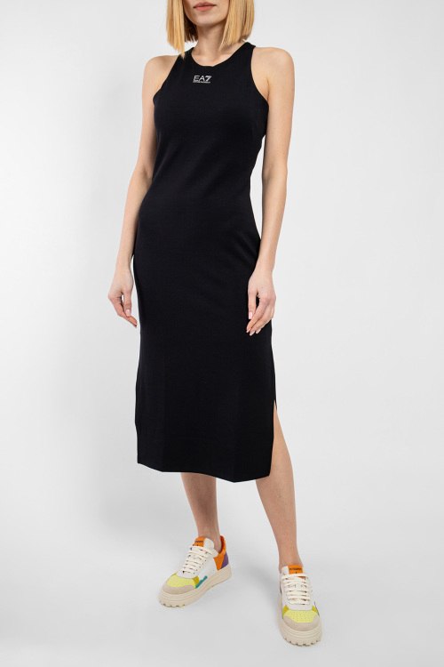 Женское черное платье из вискозы от EA7 Emporio Armani (ЕА7 Эмпорио Армани). Модель без рукавов, принт с логотипом на груди, круглый вырез горловины, разрезы по бокам, длина-миди.