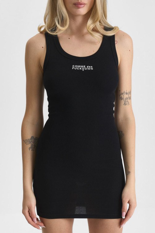 Детали: Женское черное хлопковое платье от Comme des Fuckdown (Камм дес Факдаун). Модель без рукавов, облегающий фасон, логотип на груди, длина- мини. Параметры модели: 91 см - 66 см - 96 см. Рост - 178 см. Размер на фото - S