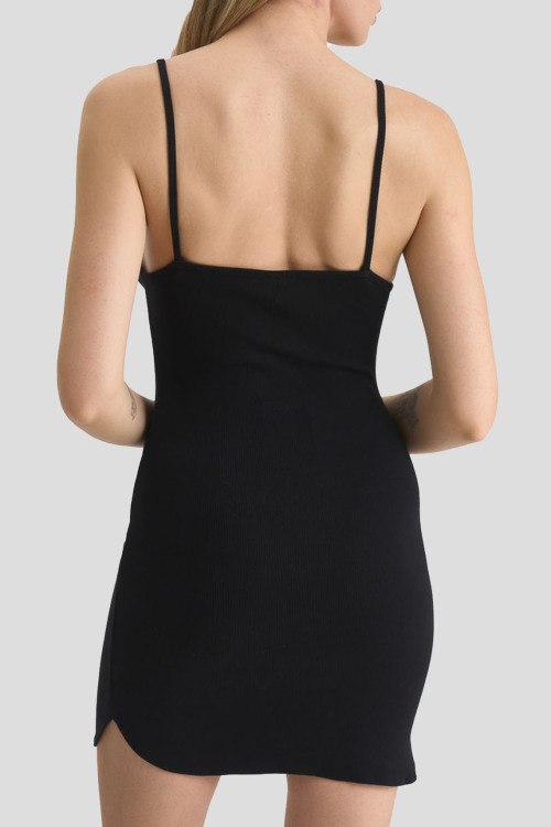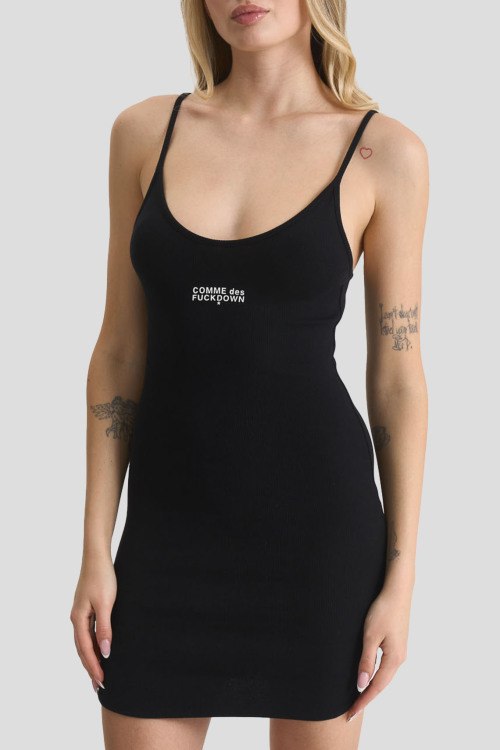 Детали: Женское черное хлопковое платье от Comme des Fuckdown (Камм дес Факдаун). Модель на тонких бретельках, глубокий вырез декольте, логотип на груди, облегающий фасон, короткая длина