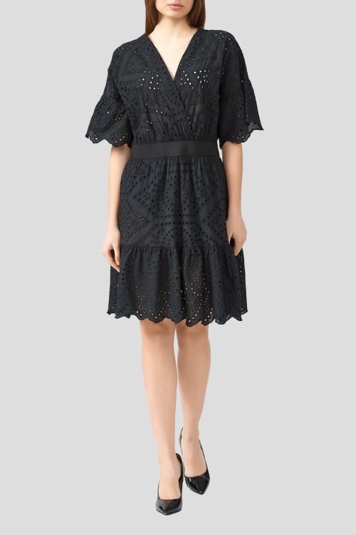 Детали: Женское черное хлопковое платье от J.B4 Just Before (Джаст Бифо). Перфорированный узор по всей поверхности, V-образный вырез, короткий расклешенный рукав, в талии на резинке, длина до колен