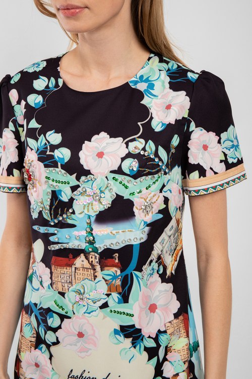 Детали: Женское черное платье из хлопка и полиэстера от Buby S (Баби Эс). Короткая длина, круглый вырез горловины, короткие рукава, удлиненная застежка-молния на спине, пришитые камни, пайетки, декорировано принтом. Размер вещи на фото S: длина: 85,5 см, ширина по груди: 45,5 см, ширина по талии : 42,5 см, ширина по бедрам: 47,5 см, длина рукава по внутреннему шву: 4,5 см, ширина рукава: 17,5 см
