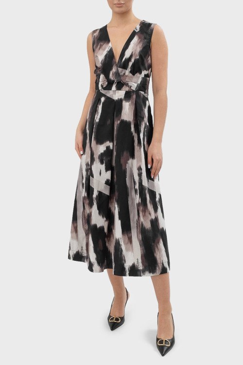 Детали: Женское черное платье из хлопка от TWINSET (Твинсет). Длина миди, V-образный вырез горловины, модель без рукавов, приталенный силуэт, дизайн с узором