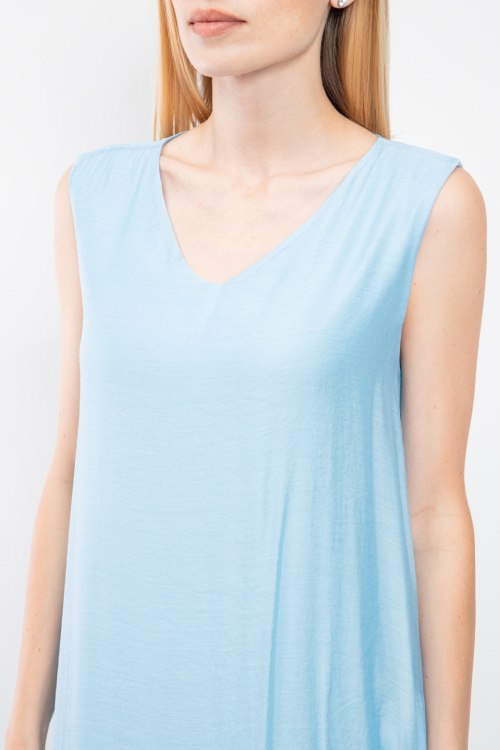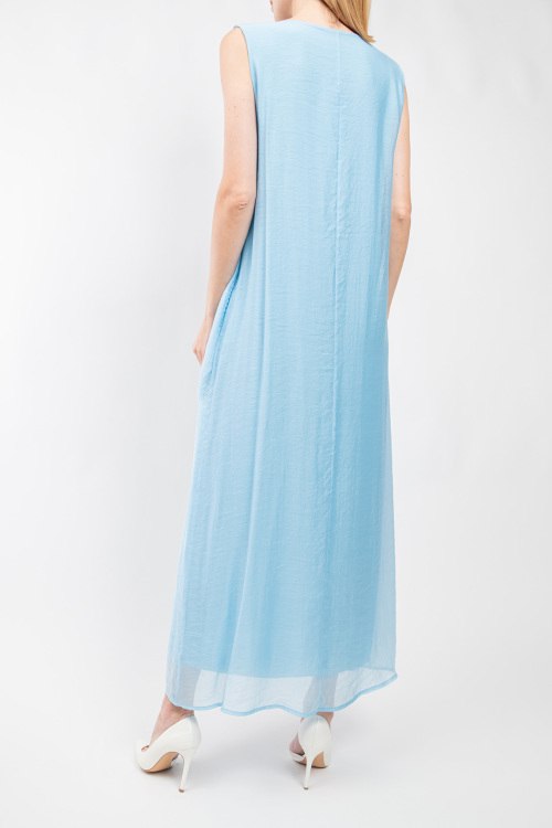 Женское голубое платье из лиоцелла от Clothe (Клозе). Модель без рукавов, боковые карманы, свободный фасон, длина-макси. Размер вещи на фото: M, длина спереди: 137 см, ширина по груди: 45 см, ширина по талии: 52 см, ширина по бёдрам: 59 см.