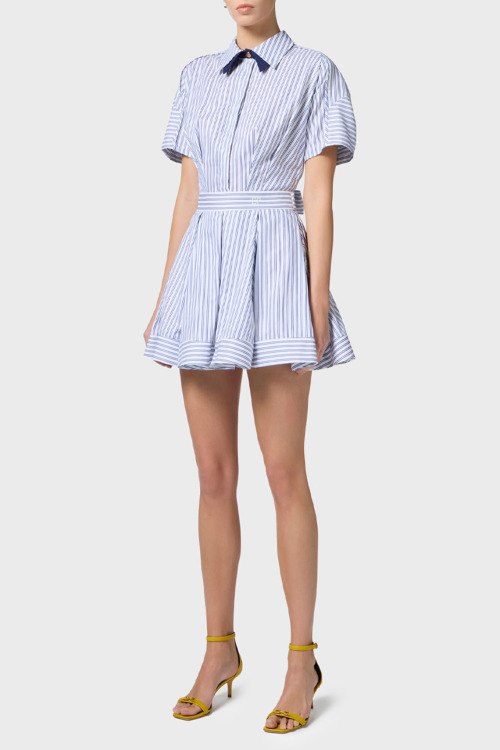 Детали: Женское голубое платье из хлопка от Elisabetta Franchi (Елизабетта Франчи). Короткая длина, дизайн в полоску, классический воротник, застежка на пуговицы, короткие рукава, открытая спина, расклешенная юбка