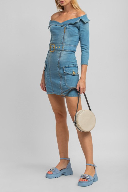 Женское голубое джинсовое платье от Elisabetta Franchi (Елизабетта Франчи). Облегающий фасон, открытые плечи, косая застежка-молния, в талии пояс с золотистой пряжкой, два накладных кармана, укороченный рукав, длина-мини.