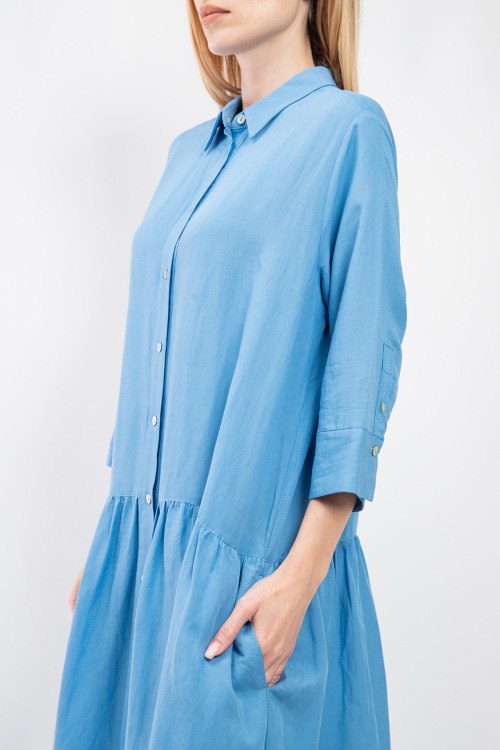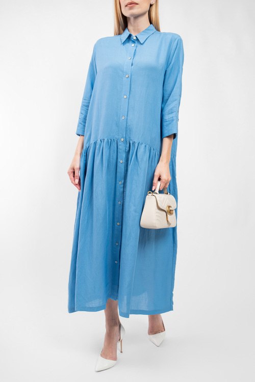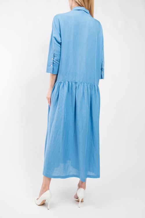 Женское голубое льняное платье-рубашка от Fabiana Filippi (Фабиана Филиппи). Отложной воротник, длина рукава 3/4, боковые карманы, застежка на пуговицы, свободный фасон, длина-миди. Замеры для размера 46: длина: 130 см, ширина по груди: 60 см, ширина по талии: 63 см, бёдра: 85 см, длина рукава: 31 см, ширина рукава: 20,5 см.
