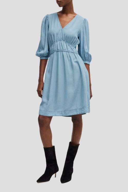 Детали: Женское голубое платье Dezzan из лиоцелла от Hugo Boss (Хуго Босс). Длина чуть выше колена, V-образный вырез горловины, рукава-фонарики 3/4, расклешенная юбка, ровный подол