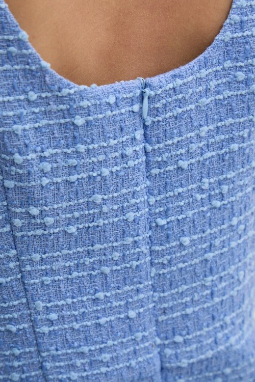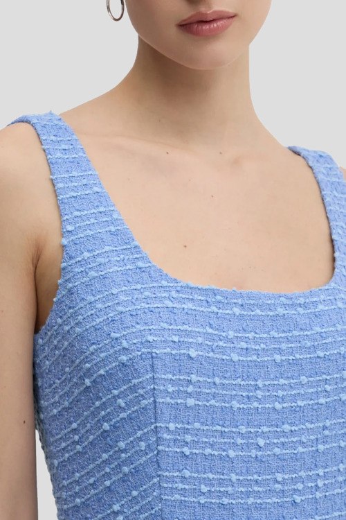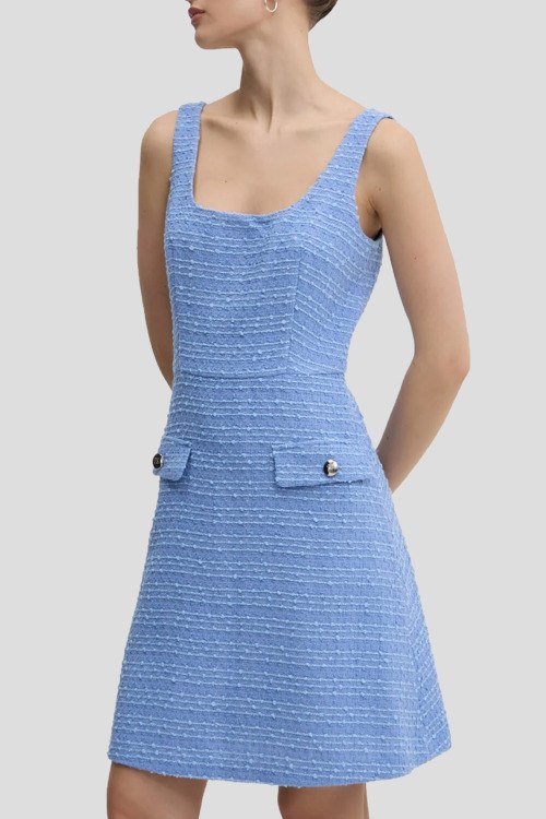 Детали: Женское голубое платье из ткани букле Kilera-1 от Hugo Boss (Хуго Босс). Фактурная ткань, квадратный вырез, два клапана с золотистыми пуговицами, застежка-молния на спине, фасон А-силуэта, длина до колен