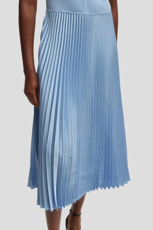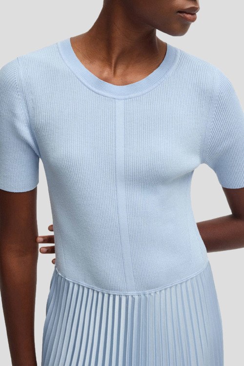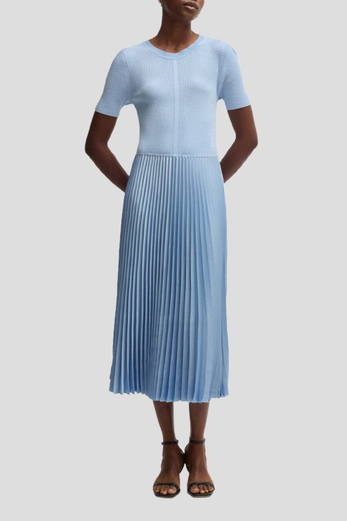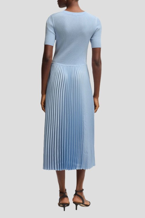 Детали: Женское голубое платье из вискозы Fadridi от Hugo Boss (Хуго Босс). Круглый вырез горловины, короткий рукав, плиссированная юбка, длина-миди