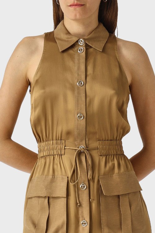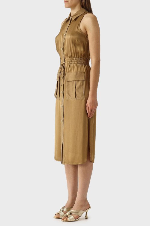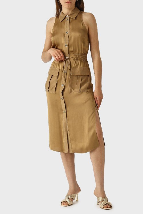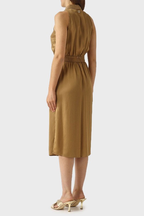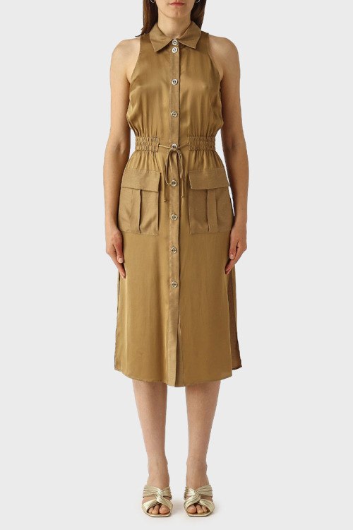 Детали: Женское горчичное платье-рубашка из вискозы от TWINSET (Твинсет). Модель с примесью льна, без рукавов, отложной воротник, застежка на пуговицы, эластичный пояс на завязках, накладные карманы, длина-миди